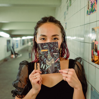 I took pictures with my collage postcards at 14th street station in Manhattan. I left my art at the station so that people can pick them up.
